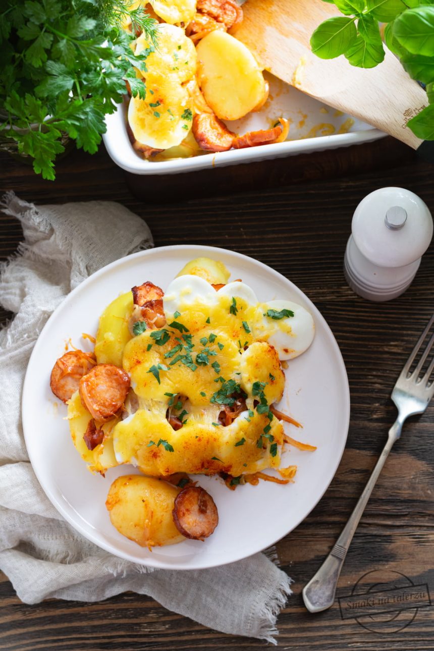 Aromatyczna zapiekanka ziemniaczana z kiełbasą i jajkami – pyszne i sycące danie na każdą okazję