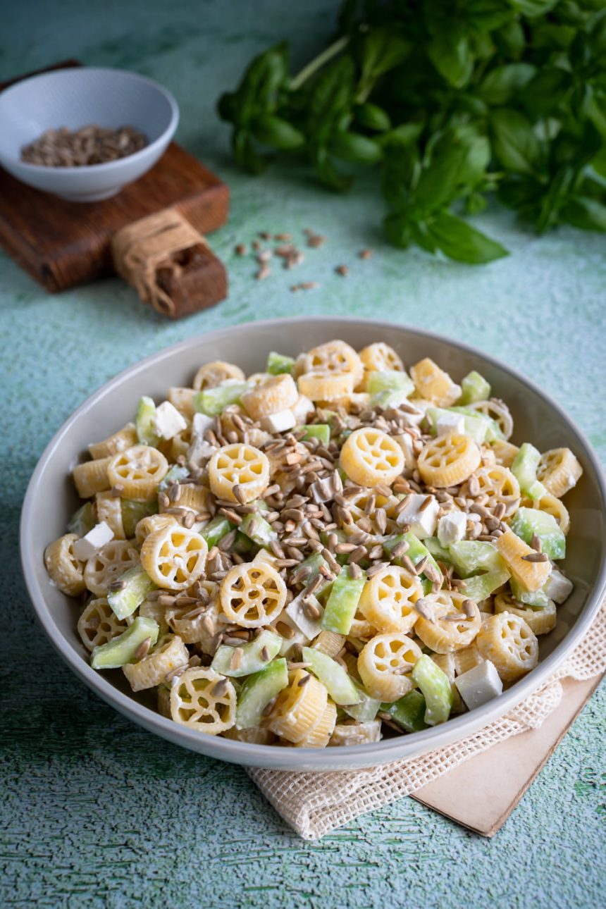 Letnia sałatka makaronowa z ogórkiem, serem feta i prażonym słonecznikiem – lekkość na talerzu