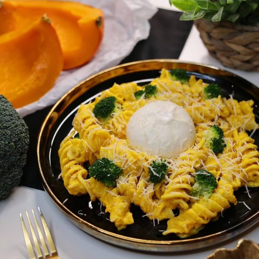 Kremowy makaron z dynią, brokułami i mozzarellą – idealne jesienne danie