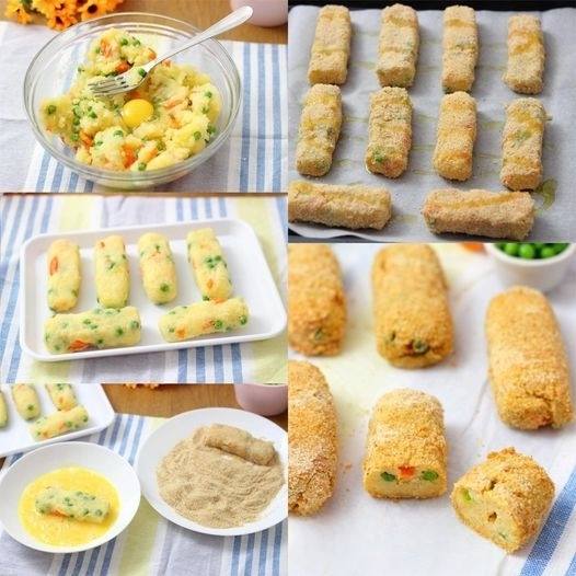 Składniki: 4 ziemniaki (ugotowane) 1 jajko 1 marchewka (ugotowana) 1/2 szklanki groszku (ugotowanego) Sól i pieprz do smaku Bułka tarta do obtaczania Dodatkowe jajko do panierowania Olej do pieczenia lub smażenia ciąg dalszy na następnej stronie