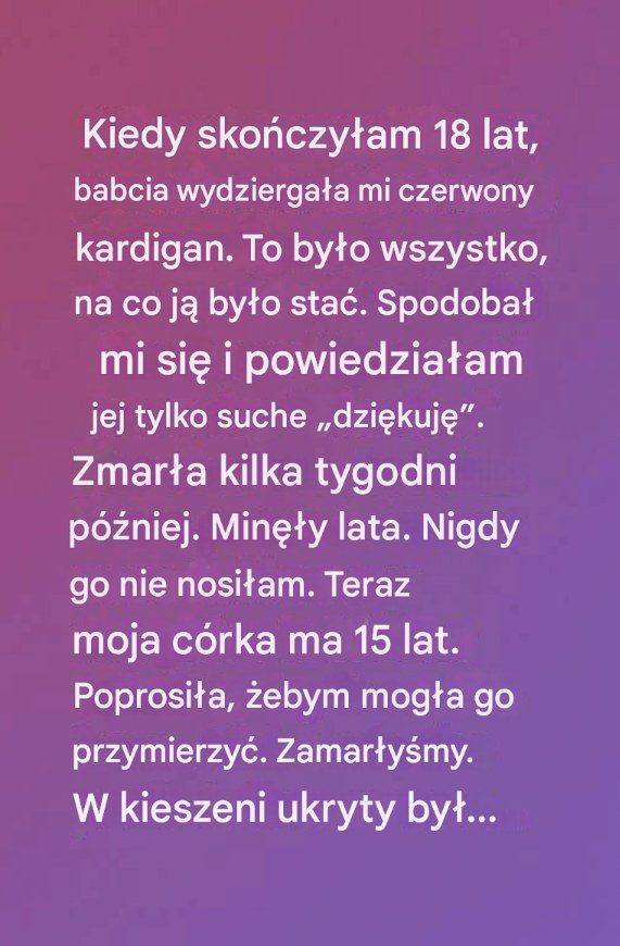 Na moje osiemnaste urodziny babcia dała mi pudełko owinięte w kwiatowy papier. W środku był czerwony kardigan, który sama wydziergała. Ledwo na niego spojrzałam. Szybkie „dziękuję”, pocałunek w policzek i wybiegłam za drzwi – goniąc za śmiechem, przejażdżkami samochodem i nocnymi planami. Mając osiemnaście lat, jeszcze nie rozumiałam, że każdy ścieg krył w sobie godziny jej miłości.