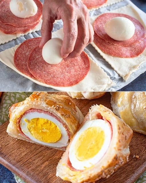 Na każdej ćwiartce ciasta francuskiego ułóż dwa plasterki salami
