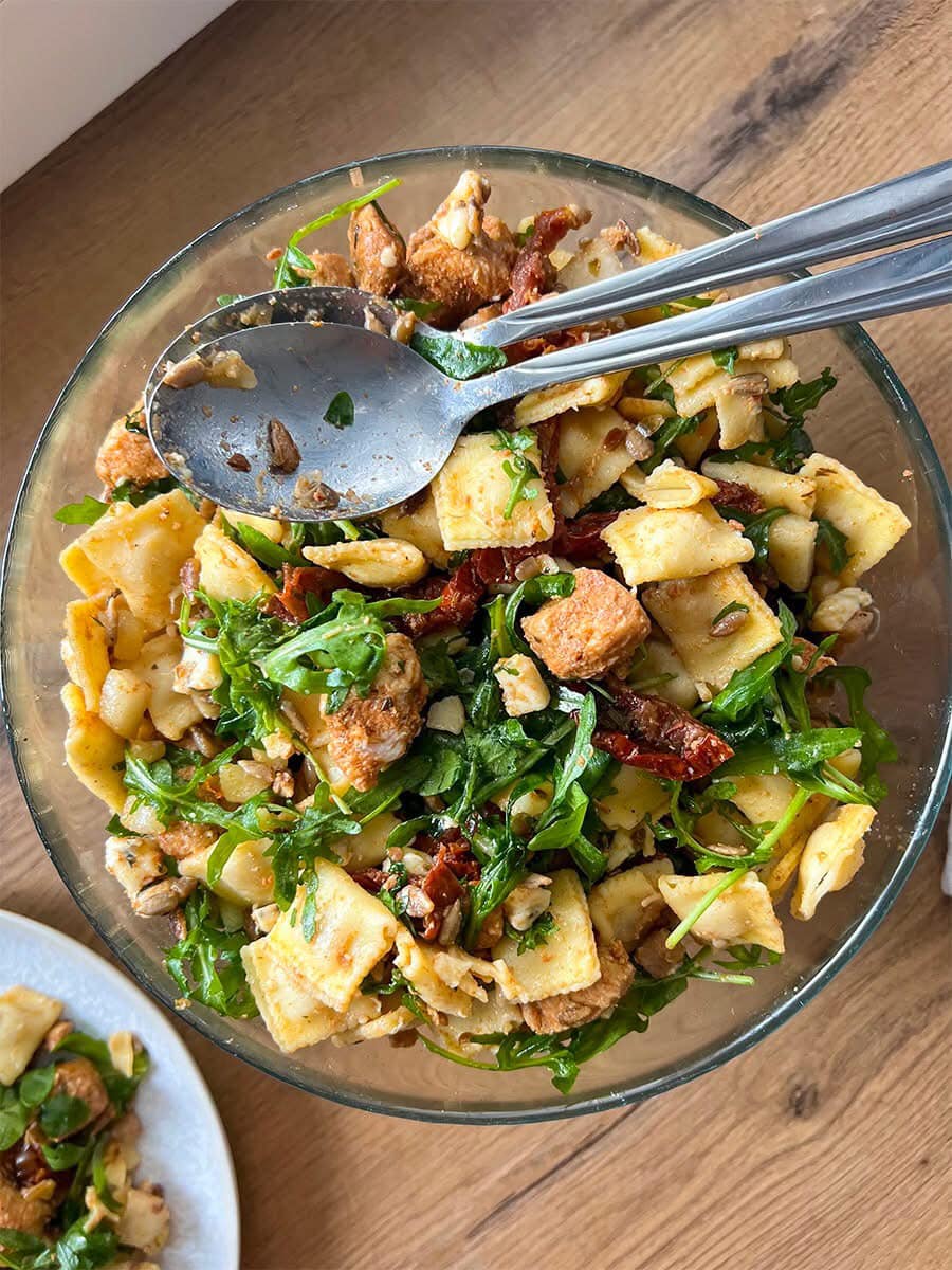 O: Tak, sałatka smakuje najlepiej po kilku godzinach spędzonych w lodówce, ale nie zaleca się przechowywania jej dłużej niż 2 dni.