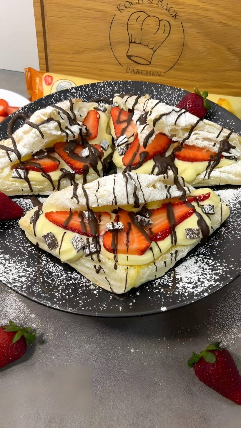 Masz ochotę na szybkie i niebiańskie ciasto, które wygląda jak z Twojej ulubionej piekarni? Te ćwiartki z ciasta francuskiego z truskawkami są zrobione w mgnieniu oka i mają wszystko, czego potrzebuje idealne ciasto: chrupiące ciasto francuskie, delikatny krem waniliowy, świeże truskawki i nutę czekolady.