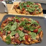 Rukolę opłucz i osusz. Pomidorki przekrój na połówki, ogórka pokrój w cienkie półplasterki, a cebulę w cienkie piórka.
