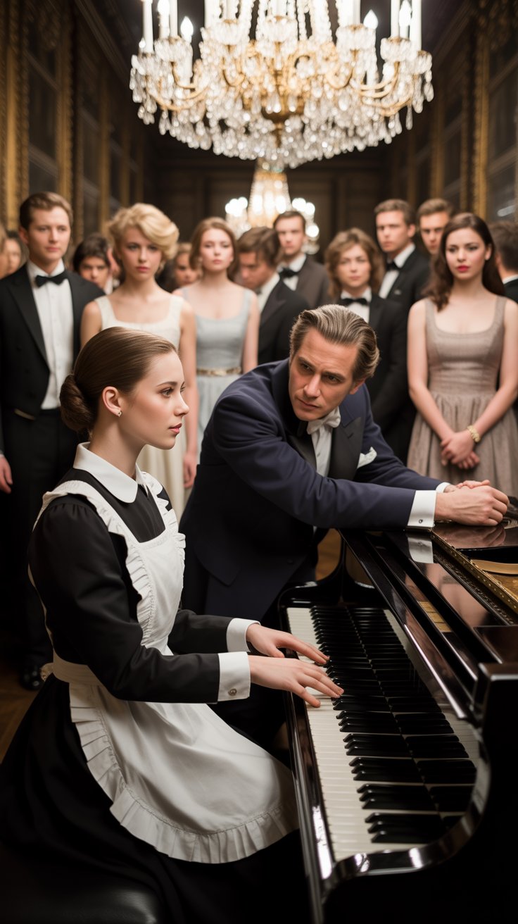Tej nocy cesarska sala lśniła żyrandolami, gdy elita miasta zebrała się na galę. Julia, pokojówka w prostym, czarno-białym uniformie, cicho polerowała podłogę.